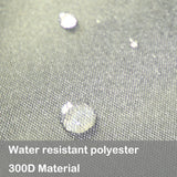 Made with thicker 300D water resistant polyester material. Warm in sun before hanging on frame. Not designed to be a long term shelter.